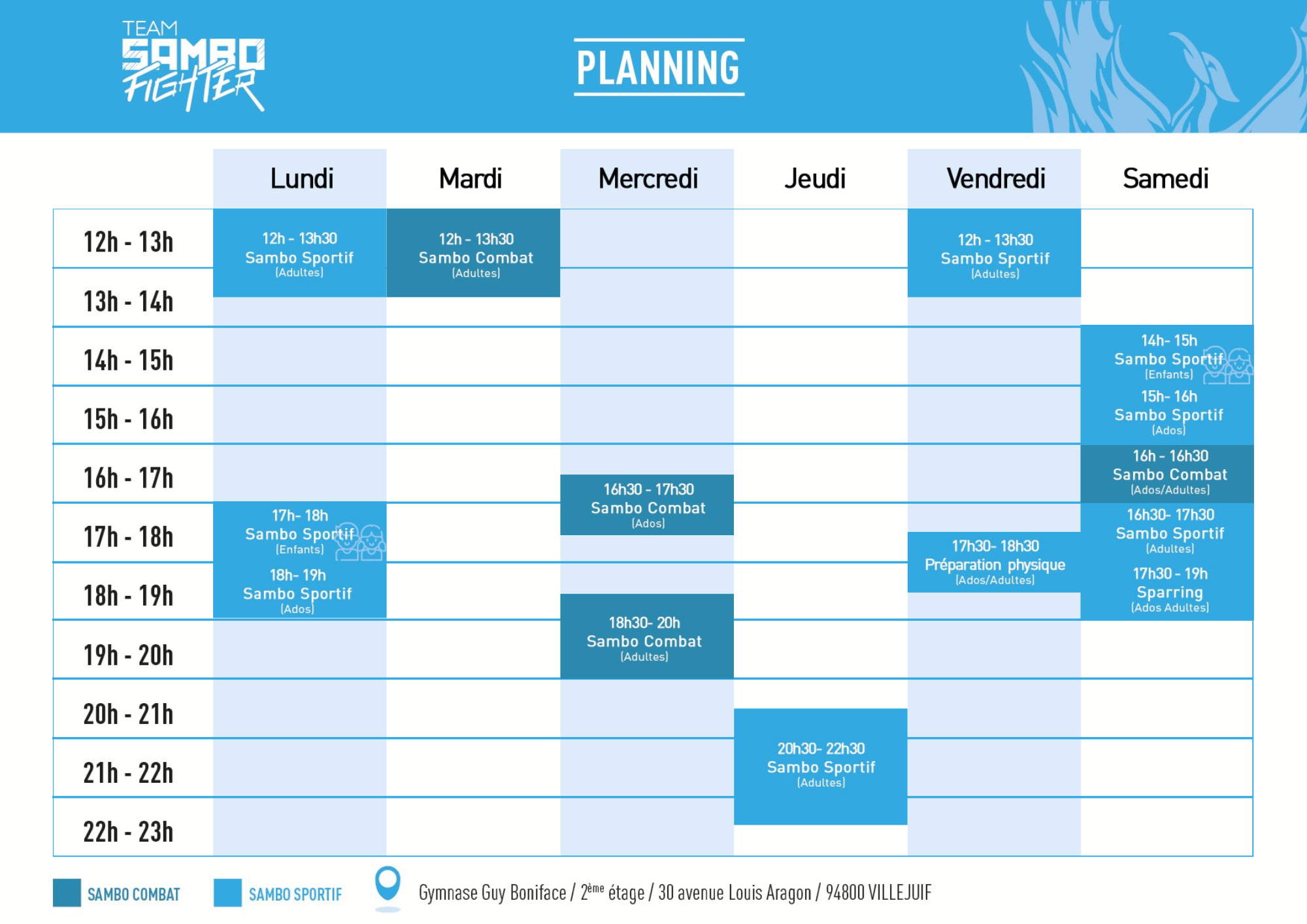 aux heures de cours, au gymnase Guy Boniface, 30 Avenue Louis Aragon, 94800 Villejuif.